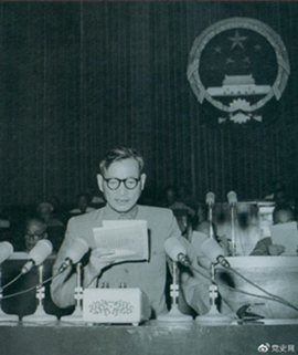 ▲1955年7月,陳云在一屆全國人大二次會議上作堅持和改進糧食統購統銷工作的報告。